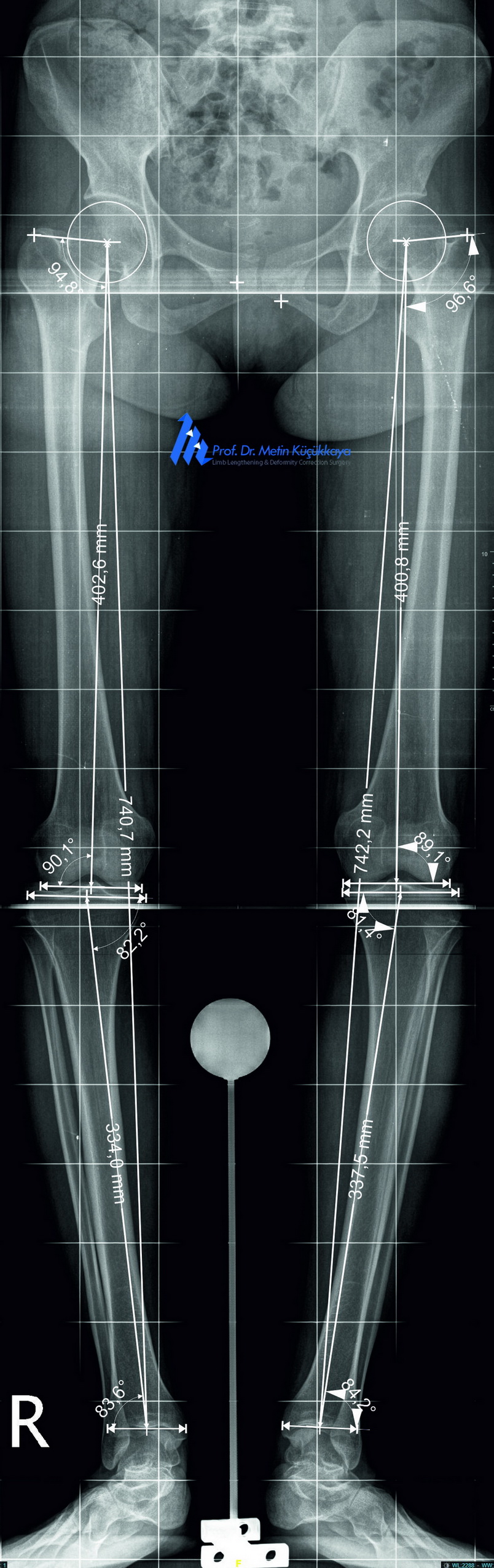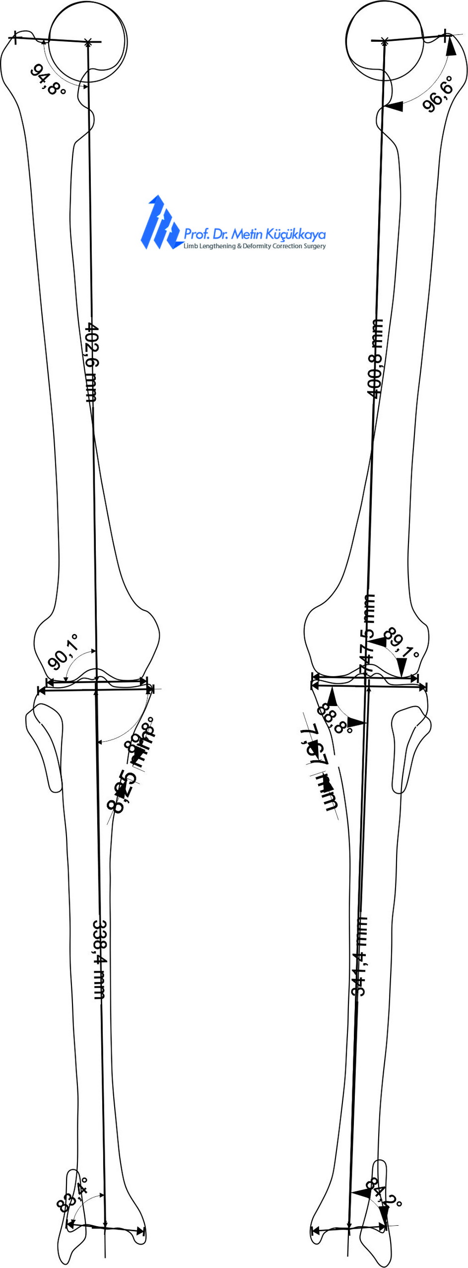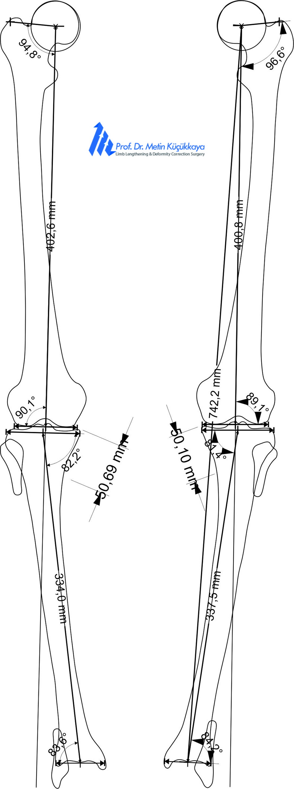 Preoperative clinical photograph and calibrated long-standing radiographs with CorelDRAW®-based measurements showing mild bilateral tibial bowing and mechanical axis deviation.